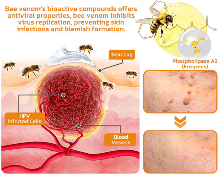 Bee venom contains several bioactive compounds, such as melittin, apamin, and adolapin, which have been proven to help eliminate skin tags and warts. A key enzyme, phospholipase A2, stands out for its ability to break down abnormal tissue, facilitating the removal of skin tags or warts.